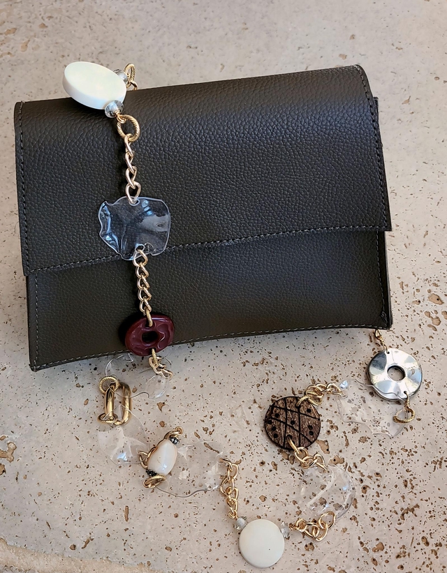 L'anse est amovible et réalisée à partir de perles de seconde main, de plastique transparent et de chaîne dorée.